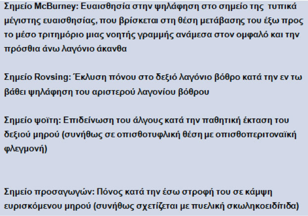 - Ψηλάφηση: εκτίμηση ευαισθησίας στην ψηλάφηση, αναζήτηση περιτοναϊκών σημείων (π.χ, ακούσια σύσπαση κοιλιακού τοιχώματος).
