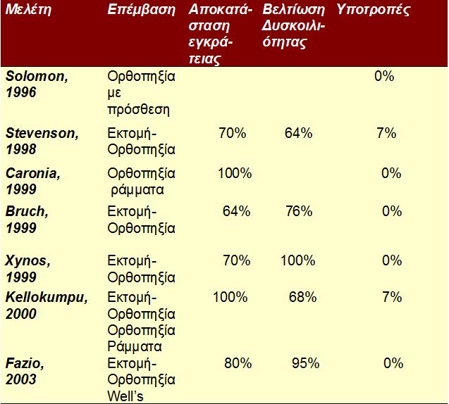 Αποτελέσματα: Αν και τα λειτουργικά αποτελέσματα είναι από ικανοποιητικά έως και άριστα στο μεγαλύτερο ποσοστό των ασθενών, τα ποσοστά υποτροπής κυμαίνονται από 10- 25%.